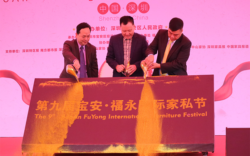 由張洪華會長等三位領(lǐng)導共同將金沙緩緩的撒在本屆牌匾上,令“第九屆寶安·福永國際家私節(jié)”幾個大字逐漸飽滿起來,相信咱們福永家私節(jié)這個品牌,一定會在未來創(chuàng)造更多的價值,就像金子一樣閃閃發(fā)光、熠熠生輝。祝賀第九屆家私節(jié)正式盛大開幕~