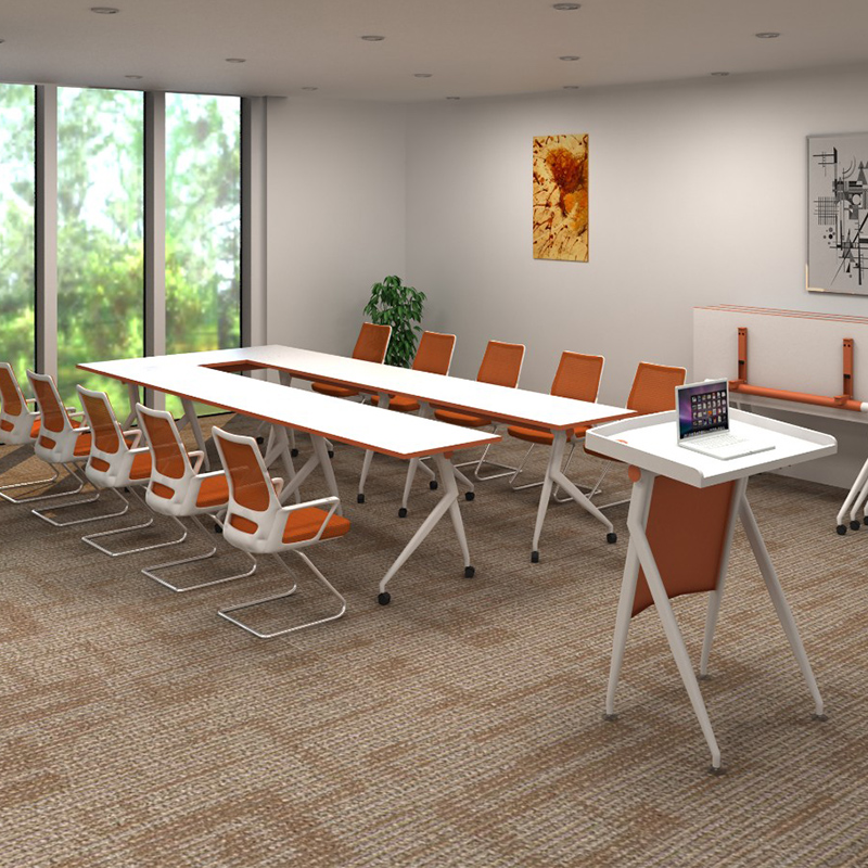 臺面:主臺面OF-0721暖白絨面,橙色PVC封邊,臺面 可折疊;